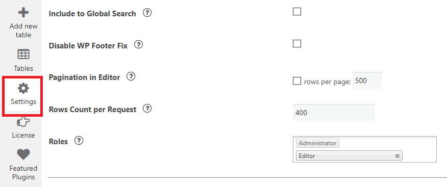 Here you can set all of the options of Data Tables Generator plugin.